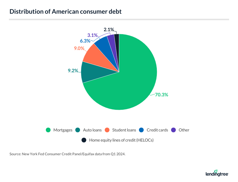 While mortgages take the lion’s share of American consumer debt at 70.3% — according to the New York Fed — auto loans account for 9.2%. Auto loan debt ($1.616 trillion) is ahead of student loan debt ($1.595 trillion) as of the first quarter of 2024.