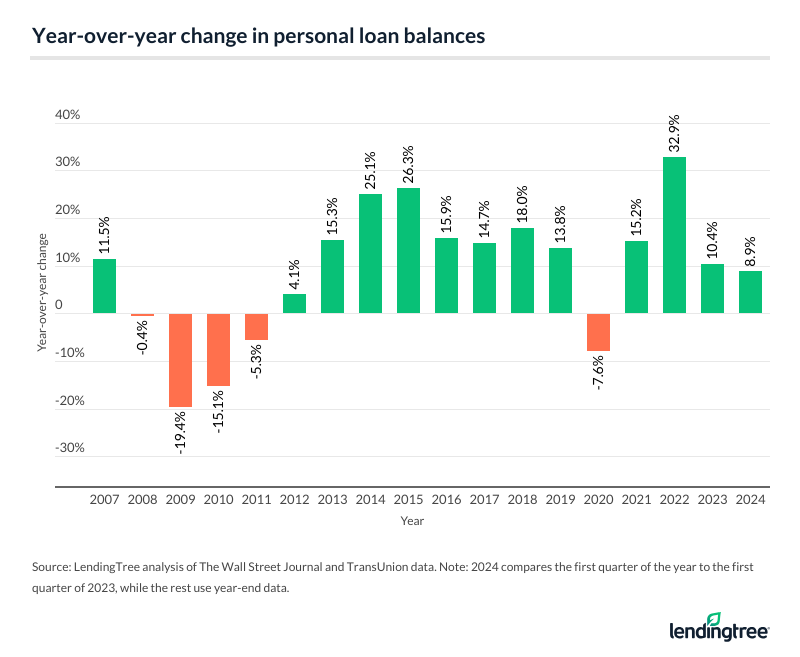But personal loan debt balances spiked 15.2% in 2021, reversing the previous year’s downward movement. Balances remained the same in the first quarter of 2024 compared to the prior quarter, but they’re up 8.9% year over year.